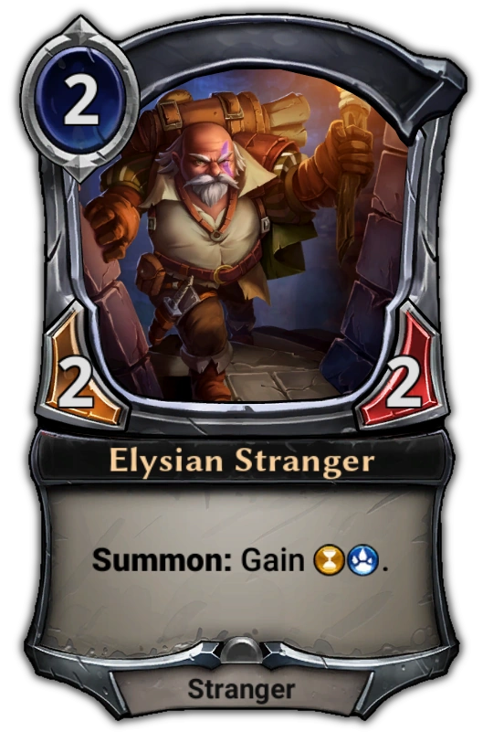 Elysian Stranger is part of a 10-card cycle of influence-fixing Strangers, one for each 2-faction pair. The first five, including Elysian Stranger, were released in The Empty Throne. The remaining five were released in Omens of the Past.