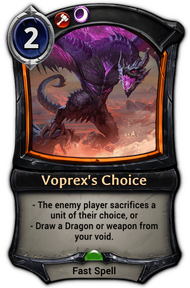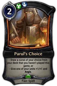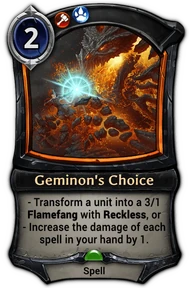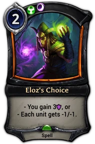 Felrauk's Choice is part of the second choices cycle of 2-faction choose one spell cards in The Flame of Xulta. These cards named for the set's characters: Kairos' Choice, Rujin's Choice, Geminon's Choice, Voprex's Choice, Aamri's Choice, Sodi's Choice, Nahid's Choice, Parul's Choice, Eloz's Choice, and Felrauk's Choice.