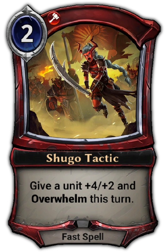 Shugo Tactic is part of the 5-card cycle of fast spells transformed from the standards cycle in The Fall of Argenport. These tactics are: Clan Tactic, Shugo Tactic, Temple Tactic, Crownwatch Tactic and Cabal Tactic.