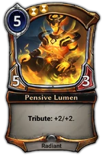 The Tribute keyword was first seen on the Set 4 spoiler reveal of Kenna, Shaman of the Scale, then described on the Eternal Discord Server.[2]. More details were later given in its mechanic reveal announcement.[1]